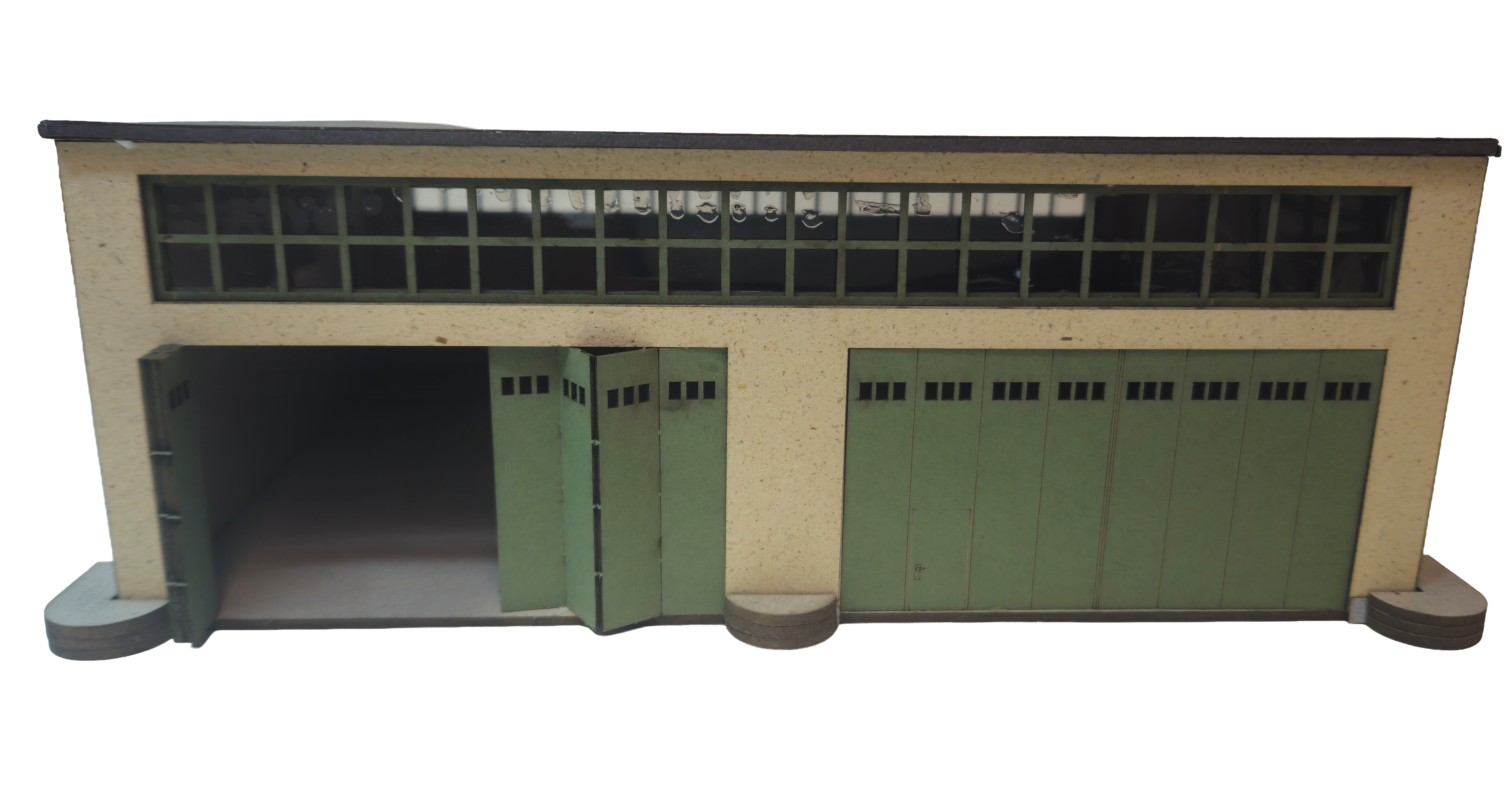 Die markante Hallenfront mit den großen Toranlagen und dem durchgehenden Fensterband verleiht dem Modell einen funktionalen, authentischen Charakter. Dadurch lässt sich die Halle sowohl in zivile als auch in militärische Themenwelten stimmig integrieren. Besonders wirkungsvoll ist die Darstellung in Verbindung mit Fahrzeugen, Werkhofszenen oder technischen Betriebsanlagen.